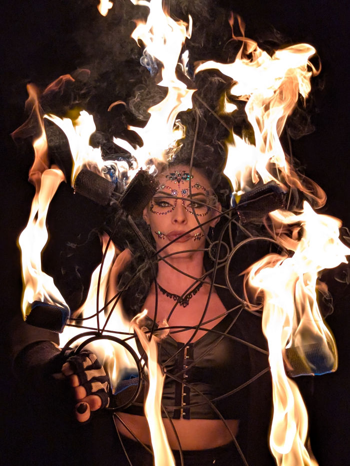 From the first spark that lit her curiosity, Little Wolf has been drawn to the beauty, danger, and artistry of fire with over ten years of professional experience. Her performance journey began with a passion for dance and movement, evolving into many unique flow arts, that eventually led her to the world of fire performance. Over the years, she's mastered an array of fire props — from mesmerizing fans, high energy swords, to elegant palm torches, double staff, dragon staff, poi, and hoops. Little Wolf creates not just a performance, but an atmosphere — blending music, movement, costuming, and flame into unforgettable experiences.